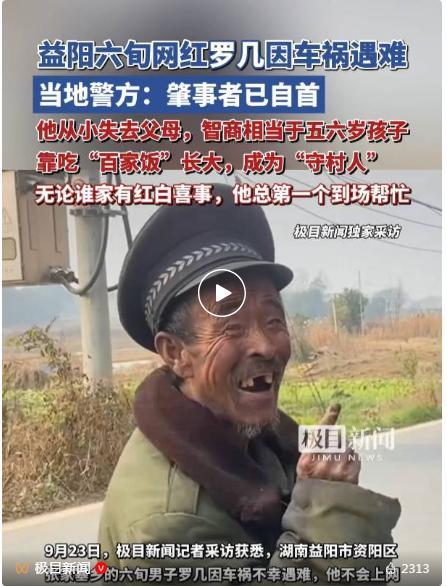湖南益阳网红罗几车祸遇难 肇事者自首!9月23日,湖南益阳市资阳区张家塞乡的六旬男子罗几因车祸不幸遇难。据了解,罗几今年六十多岁,从小失去父母,智商仅相当于五六岁的孩子,靠吃“百家饭”长大。当地居民介绍,9月20日晚,罗几在路上溜达时被车撞倒,但没有人注意到,第二天早晨才有街坊...