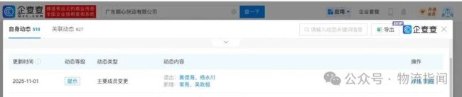 顺心捷达更换董事长:黄偲海卸任,常亮接任企查查APP显示,11月1日,广东顺心快运有限公司(简称顺心捷达)发生信息变更,黄偲海卸任董事长,常亮接任。