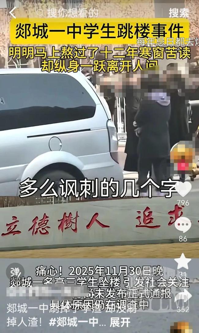 山东郯城一高中生校外坠楼身亡 事件引发网友关注今天早上,多位网友在社交平台发布视频,称山东省临沂市郯城第一中学一名高中生坠楼身亡,引起广泛关注。上午9点半左右,记者联系了郯城第一中学,校方工作人员证实,事件发生在11月29日晚,坠楼学生为高三21班学生