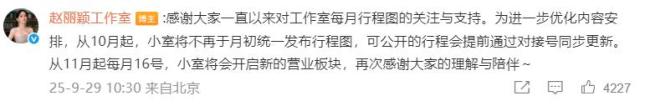 行程图 赵丽颖工作室调整发布计划9月29日,赵丽颖工作室宣布调整行程发布方式。从10月起,工作室将不再于月初统一发布行程图,可公开的行程会提前通过对接号同步更新。从11月起,每月16号,工作室将会开启新的营业板块,感谢大家的理解与陪伴