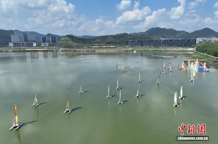 浙江杭州:2025中国家庭帆船赛扬帆绿水青山间9月27日,众多帆船启航。当日,2025中国家庭帆船赛·杭州站在浙江杭州临安青山湖拉开帷幕,来自北京、上海、武汉等10个城市的40组家庭近百名选手在绿水青山间扬帆。(无人机照片)中新社记者 王刚 摄