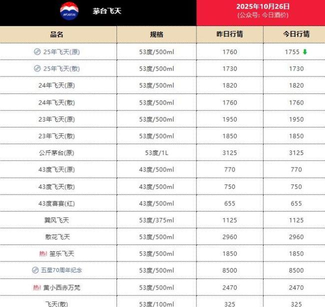 茅台价格继续下跌 市场行情波动格隆汇10月26日|今日酒价披露的批发参考价显示,10月26日,25年飞天茅台原箱较前一日下跌5元,报1755元/瓶;25年飞天茅台散瓶较前一日持平,报1730元/瓶