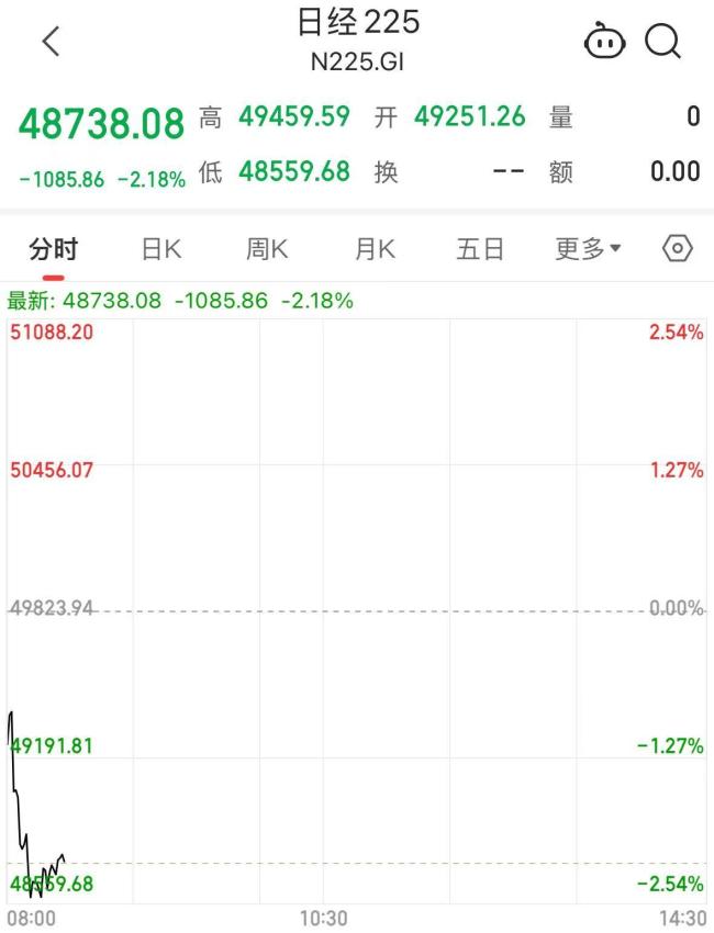 日股再度大跌 市场情绪受挫21日,日本股市表现疲软,日经225指数迅速跌破49000点。截至发稿时,该指数跌幅超过2%,报48738点,再次下跌超过千点。此前在本周二(18日),日经225指数也出现了开盘跳水跌超千点的情况