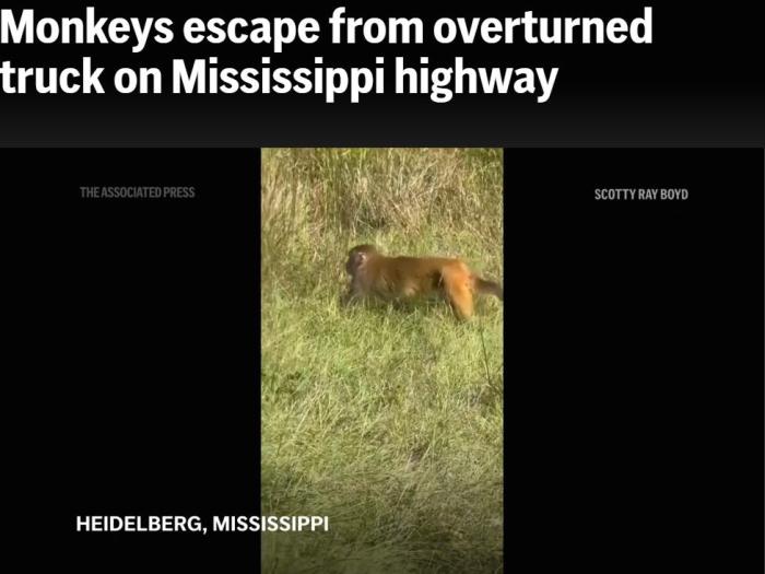 中新网10月29日电 据美联社报道,当地时间28日,美国密西西比州一条高速公路上,一辆运送猴子的卡车发生侧翻,导致被运输的猴子逃脱。