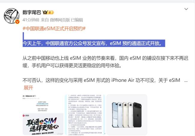 手机无卡化时代正加速到来 eSIM商用进入倒计时数码博主“数字尾巴”指出,eSIM技术将带来更灵活稳定的用号体验。中国联通开放预约标志着手机通信方式的重要变革。中国联通官方公众号于10月13日宣布正式开放eSIM业务预约通道。截至发稿时,预约人数已突破6万人,且数字仍在快速增长