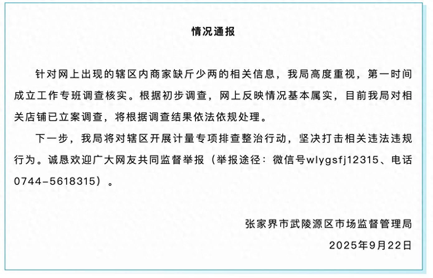 5家商铺4家缺斤少两?张家界通报!5家商铺4家缺斤少两?张家界通报。9月22日,湖南张家界市武陵源区市场监督管理局通报:针对网上出现的辖区内商家缺斤少两的相关信息,我局高度重视,第一时间成立工作专班调查核实。根据初步调查,网上反映情况基本属实,目前我局对相关店铺已立案调查,...