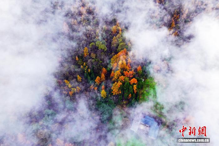 湖北恩施:红黄绿黛绘斑斓图为雾中绝美秋景。张远明 摄 图为秋叶点缀连绵山峦。张远明 摄 图为恩施市层林尽染秋意浓。张远明 摄
