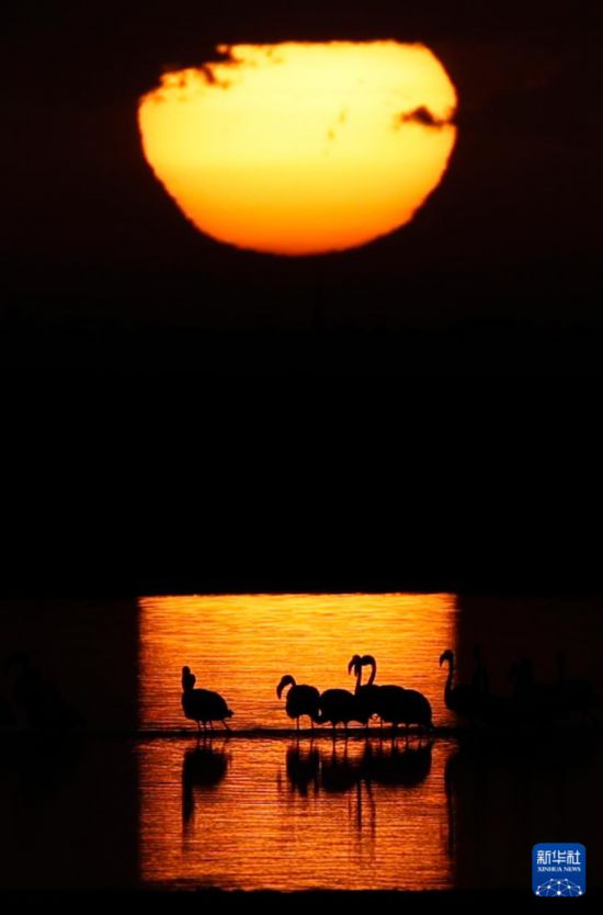 埃及:火烈鸟越冬加龙湖这是12月6日日出时分在埃及法尤姆省加龙湖拍摄的火烈鸟。 每年冬季,大批火烈鸟会飞抵埃及法尤姆省内的加龙湖觅食越冬。 新华社发(艾哈迈德·戈马摄)