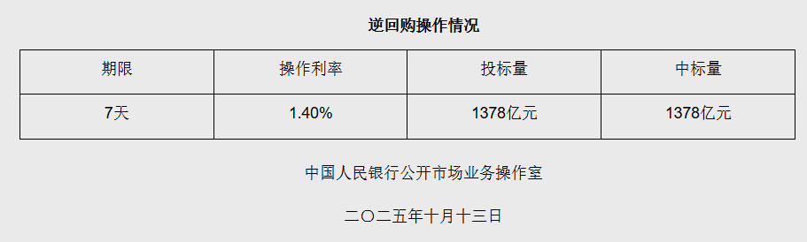 10月13日央行开展1378亿元7天期逆回购操作中新网10月13日电 据央行网站消息,2025年10月13日中国人民银行以固定利率、数量招标方式开展了1378亿元7天期逆回购操作。具体情况如下: